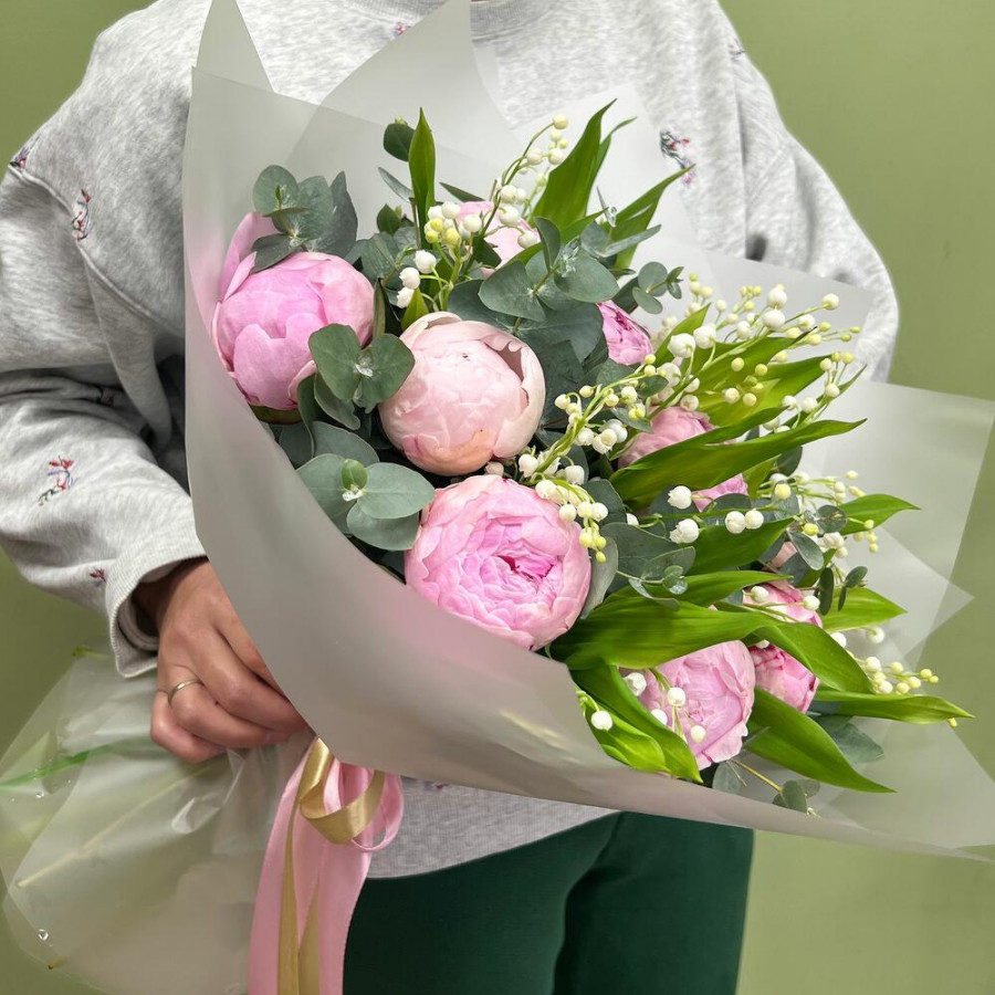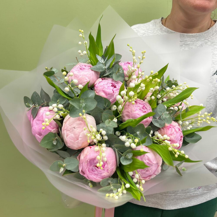 На фото букет ландышей и пионов. В составе: ландыш 25 шт, пион 11 шт, эвкалипт 5 шт, дизайнерская упаковка 1 шт, атласная лента 1 шт, . Все цветы свежие и ароматные, букет красиво оформлен и отлично подходит для подарка. Доступна доставка цветов или самовывоз.