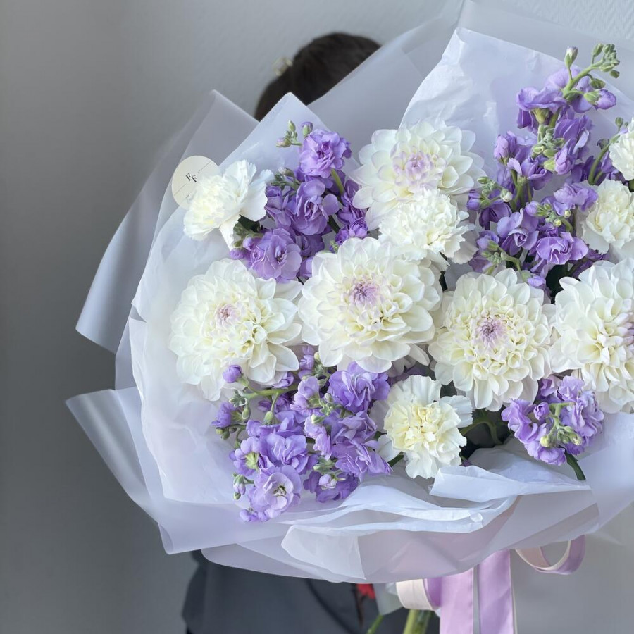 На фото букет «сиреневое облако». В составе: георгина 5 шт, маттиола 4 шт, гвоздика 5 шт, дизайнерская упаковка 1 шт, атласная лента 1 шт, . Все цветы свежие и ароматные, букет красиво оформлен и отлично подходит для подарка. Доступна доставка цветов или самовывоз.