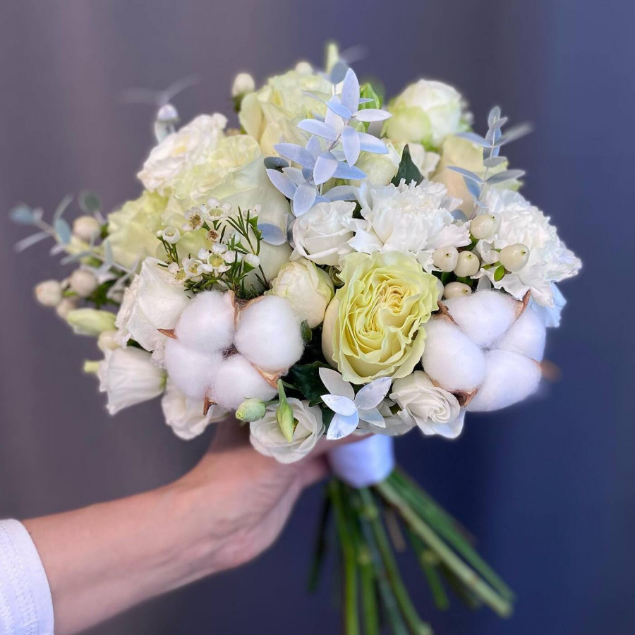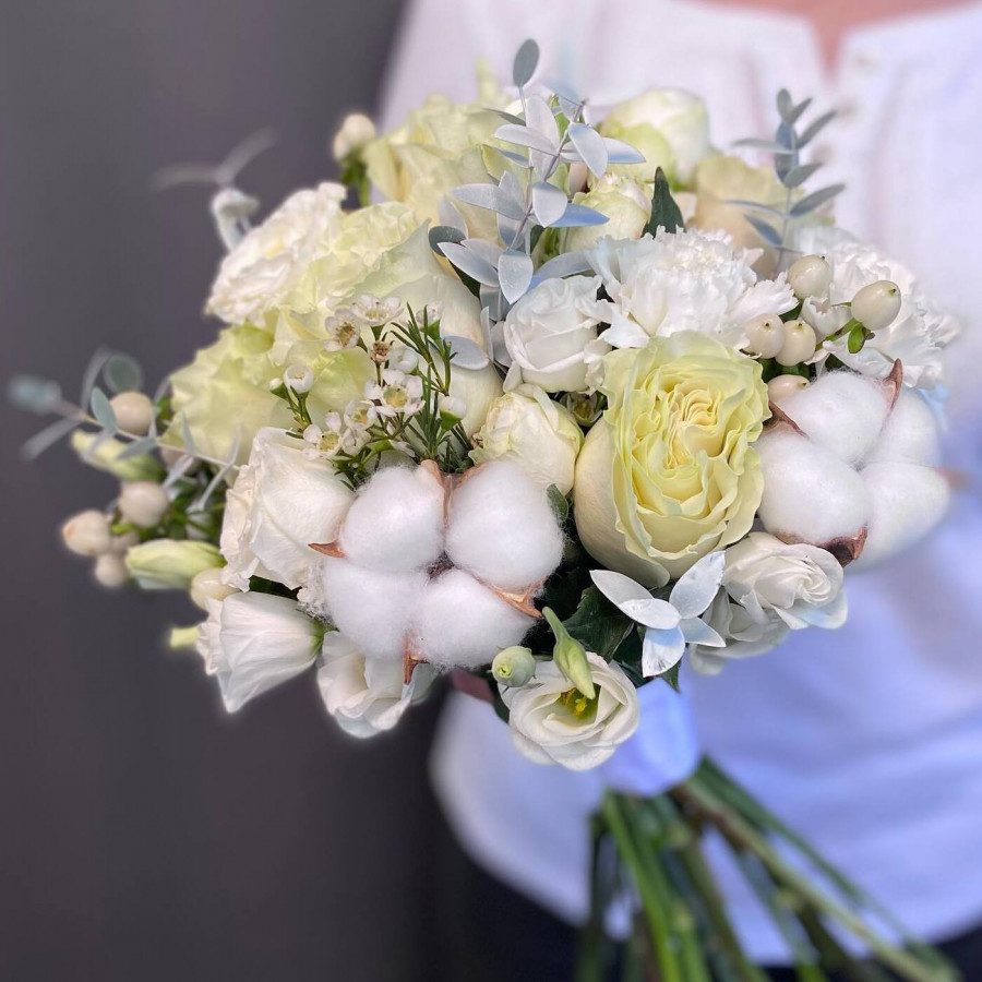 На фото свадебный букет с хлопком. В составе: хлопок 5 шт, гвоздика 5 шт, роза 5 шт, кустовая роза 4 шт, хамелациум 3 шт, гиперикум 2 шт, . Все цветы свежие и ароматные, букет красиво оформлен и отлично подходит для подарка. Доступна доставка цветов или самовывоз.